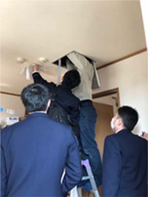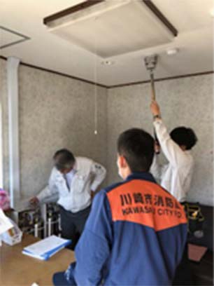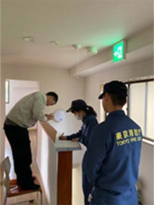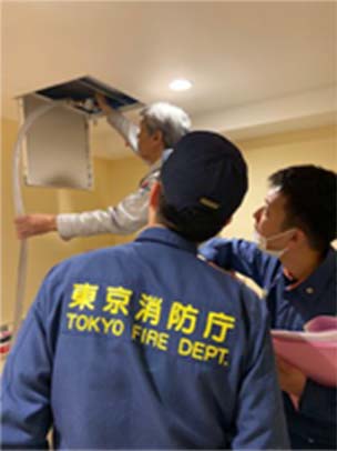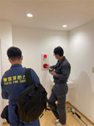 管轄消防機関の検査を受けるにあたり、消防設備士の有資格者が立会い対応いたします。一部の写真ではありますが、消防検査の様子をご覧いただけます。